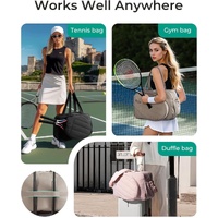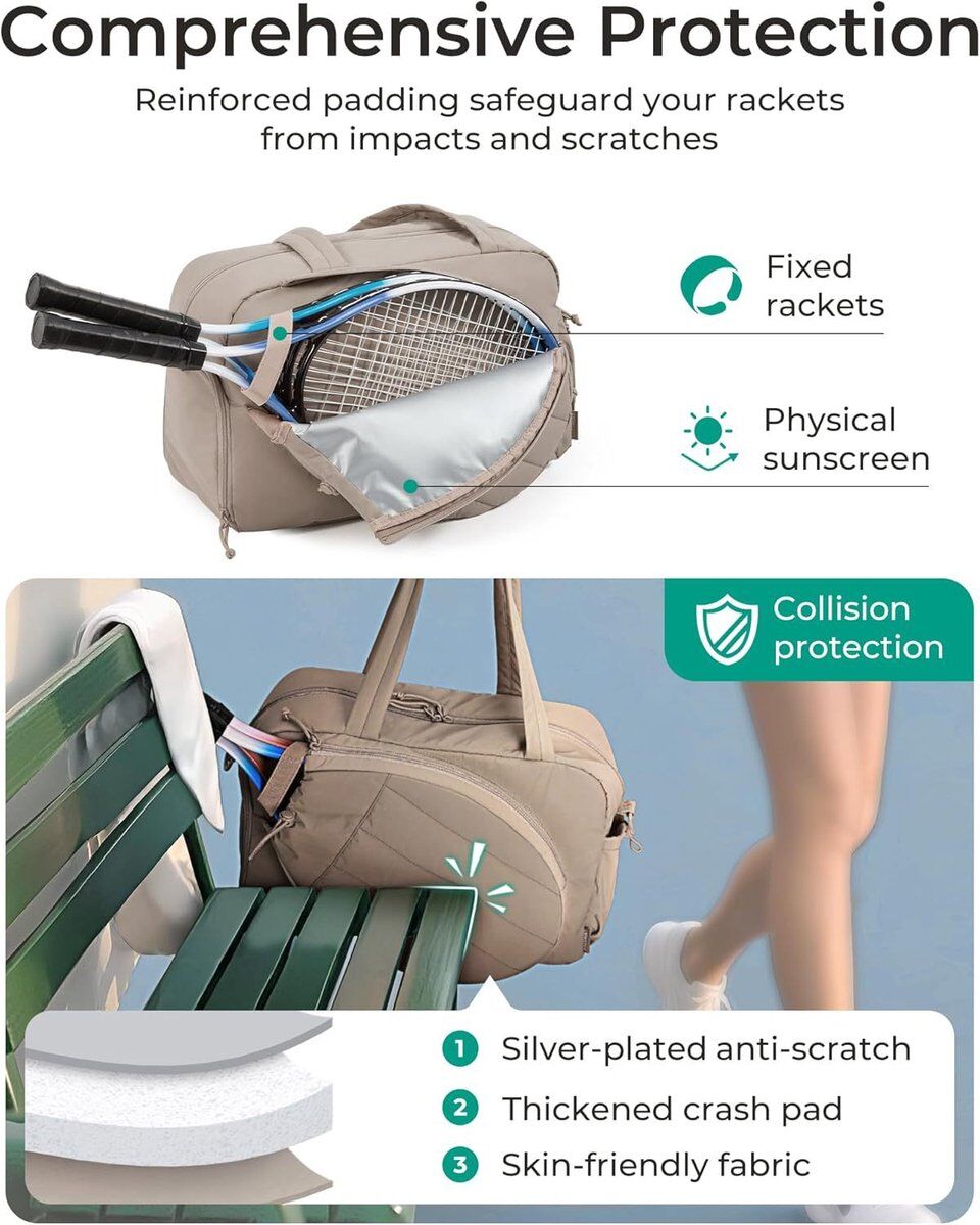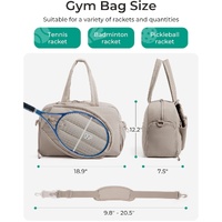 Key Features: All-in-One Organization: With a 42-liter capacity, this bag offers space for all your essentials. The waterproof PVC interior pocket keeps wet items (like toiletries or workout clothes) separate from the rest. Optimal Racket Protection: The side compartment is specially designed to store two rackets safely and scratch-free, protected from the rest of the contents. Hygienic Shoe Compartment: A ventilated, separate compartment for your sneakers prevents dirt and odors from entering the main compartment. Multiple Carrying Ways: Comes with a long, adjustable strap to comfortably carry the bag as a shoulder bag. Handles provide an additional carrying option. Compact & Convenient: The bag is foldable for easy storage when not in use, ideal for travel. Specifications: Volume: 42 Liters Capacity: Fits 2 tennis rackets Special Compartments: Waterproof PVC inner compartment, ventilated shoe compartment, protected racket compartment on the side How to Carry: Shoulder strap (included) & handles Color Options: Pink, Black, Khaki, Gray What's in the box: 1x Foldable tennis bag 1x Adjustable shoulder strap Show more