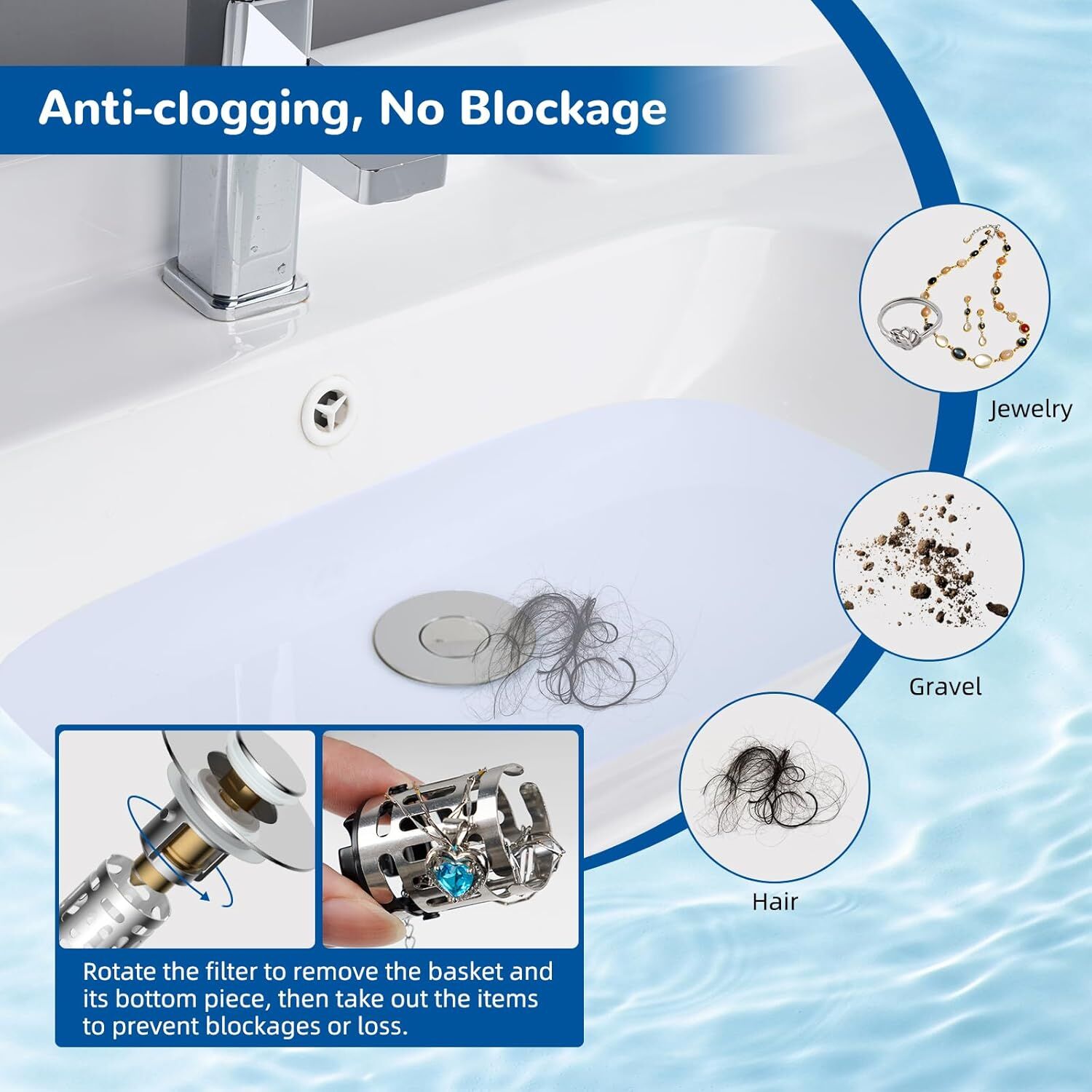 [Upgraded 3 in 1 Design] The bathroom sink drain strainer boasts an innovative 3-in-1 design that seamlessly integrates water storage, rapid drainage, and effective filtering functions. In water storage mode, it caters to your soaking or washing needs, while the drainage mode efficiently empties the sink. The built-in basket captures small items like hair, jewelry, and debris, preventing them from clogging the drain and allowing you to recover valuable items like earrings and necklaces.