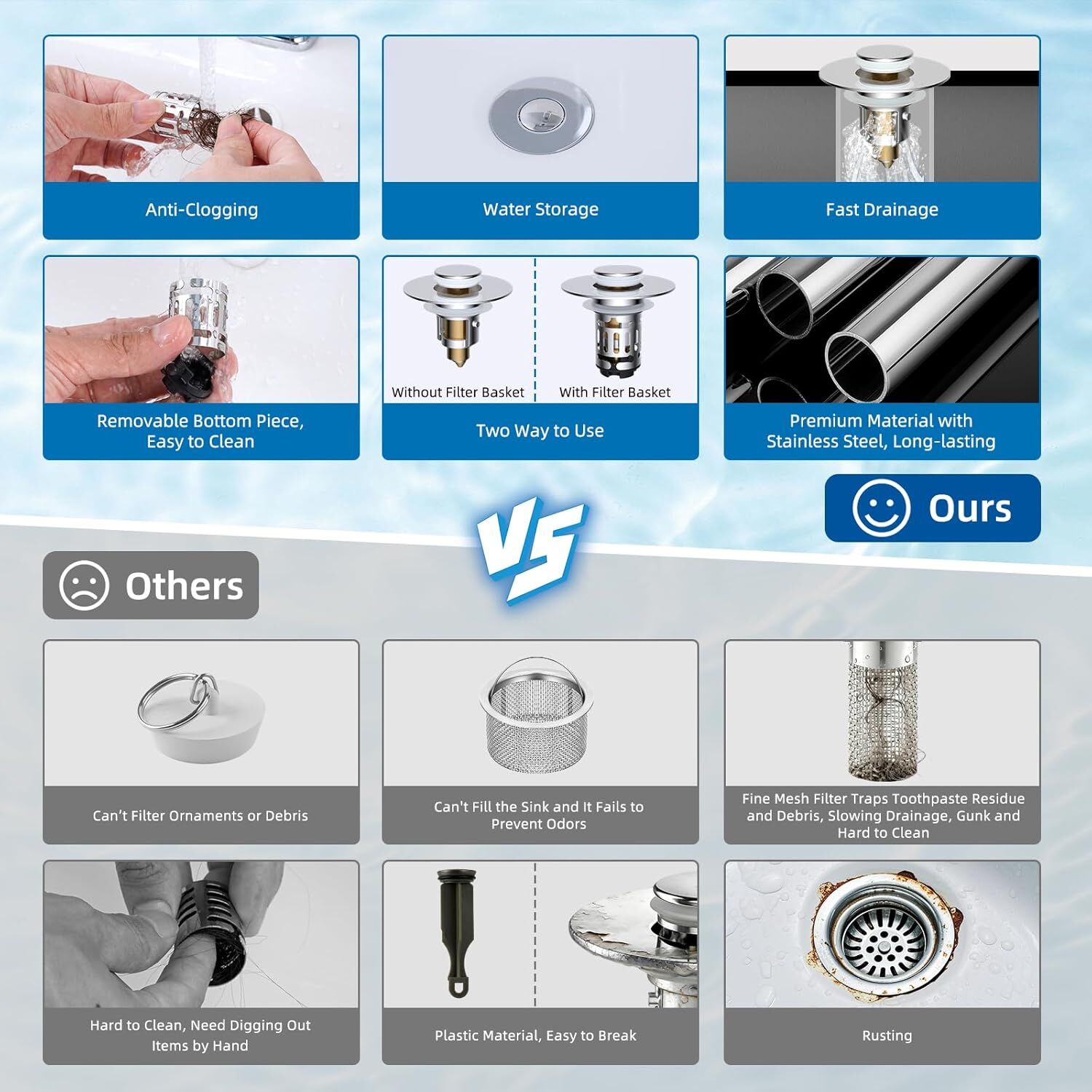 [Innovative Two-Layer Removable Basket] Our sink stopper features a dual-layer removable stainless steel basket designed for two usage modes. With the basket in place, it effectively filters small items to prevent blockages. When removed, the sink strainer enables swift drainage through two larger holes, promoting faster water flow and streamlining your daily tasks. Plus, the two-piece removable basket is easier to clean and maintain, ensuring better hygiene than traditional fixed-bottom baskets
