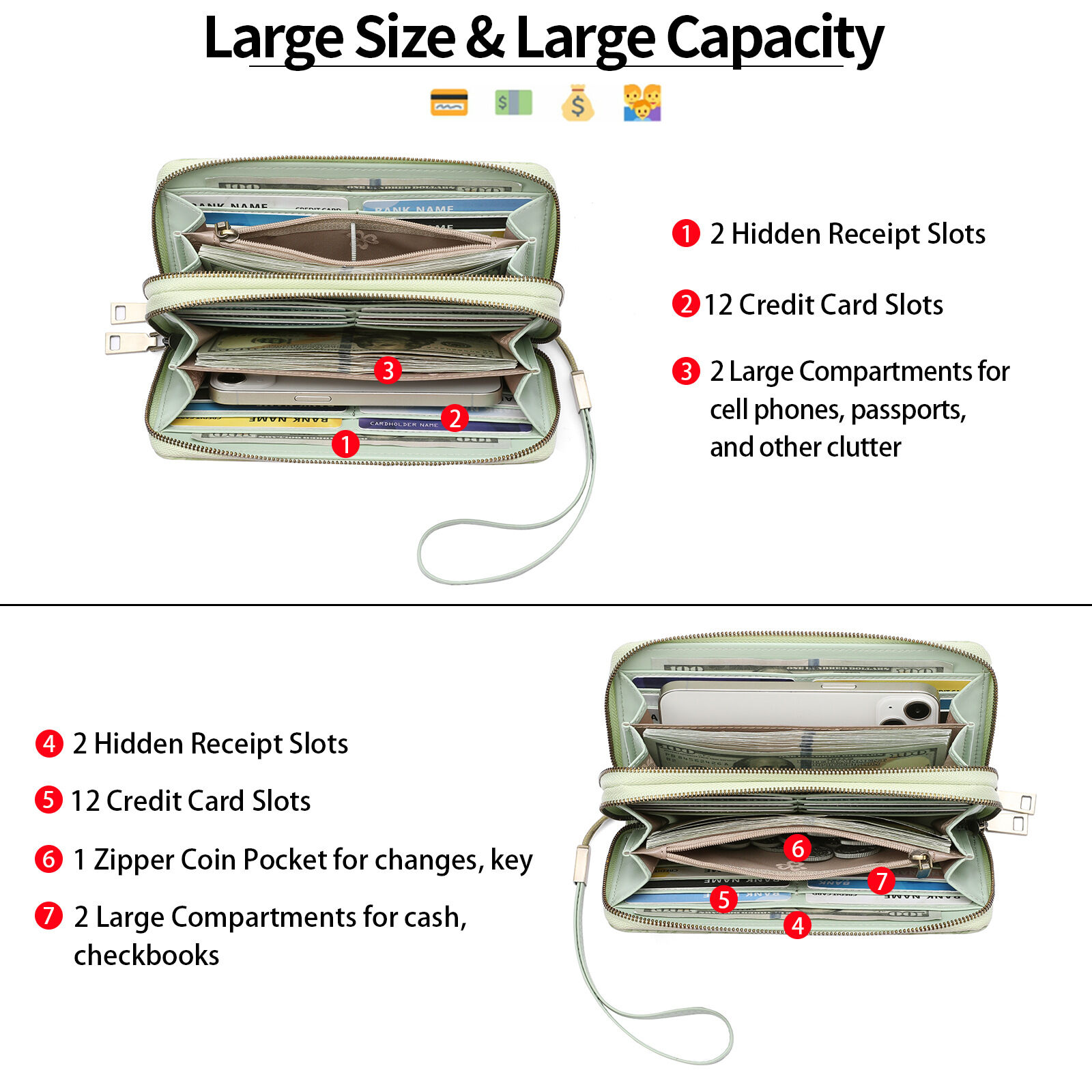 - Massive Capacity: Say goodbye to clutter! This wallet boasts an impressive interior featuring 24 credit card slots, 4 hidden receipt slots, 4 large compartments, and 1 zippered coin pocket.