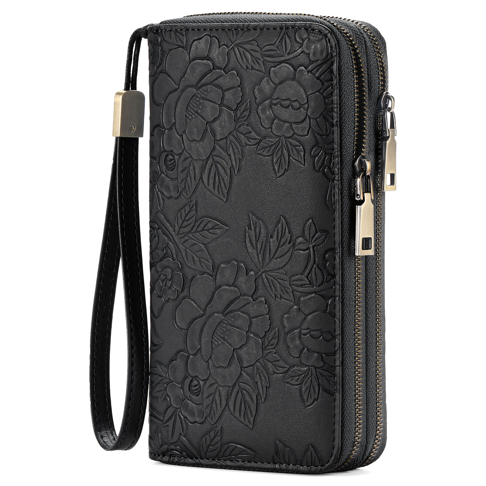 Women's Large Capacity Double Zip Wallet Clutch | PU Leather Floral Embossed Wristlet | Phone Holder