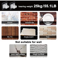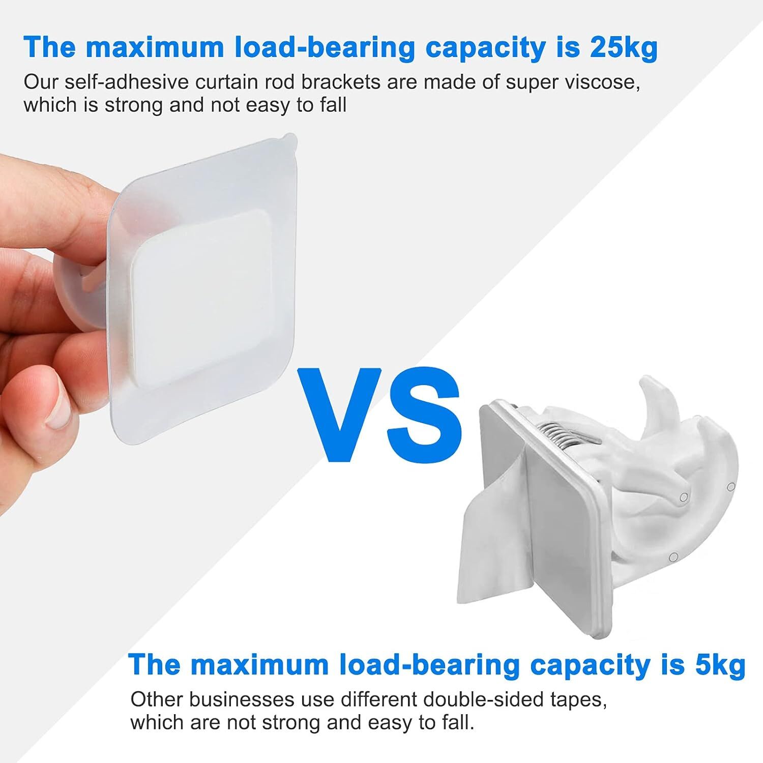 Packaging: 4 white self-adhesive curtain rod brackets, size (44*33*43mm), adhesive surface: 60*60*1mm, groove diameter: 22mm, usable rod diameter: approximately 15-22mm. This product is suitable for smooth walls, not suitable for rough, textured walls. Durable material: Made of high-quality ABS plastic and strong viscous glue. Strong viscosity, not easy to fall off, sturdy and durable, high hardness, not easy to deform or break, and has a long service life. Maximum load: 25 kg. Unique design: Thicker self-adhesive hook. The glue part is larger than the base, stickier, not easy to fall off, no drilling, no marks. The spring clip holds the curtain rod firmly and doesn't slide easily. The hook is polished, smooth and delicate, no burrs, and won't hurt your hands. Easy to install: 1. Wipe the wall dry with a cloth. Make sure there are no water stains on the wall, otherwise the hook may come off easily. 2. Remove the glue from the back of the hook. 3. Press the hook firmly to ensure it adheres better to the wall. 4. Place the rod in the slot and clamp it tight. Wide application area: This product has a wide range of applications and is suitable for various situations, such as in the bathroom, kitchen or hotel room. It is suitable for various surfaces, such as furniture, smooth glass, mirrors, ceramic tiles and stainless steel surfaces.