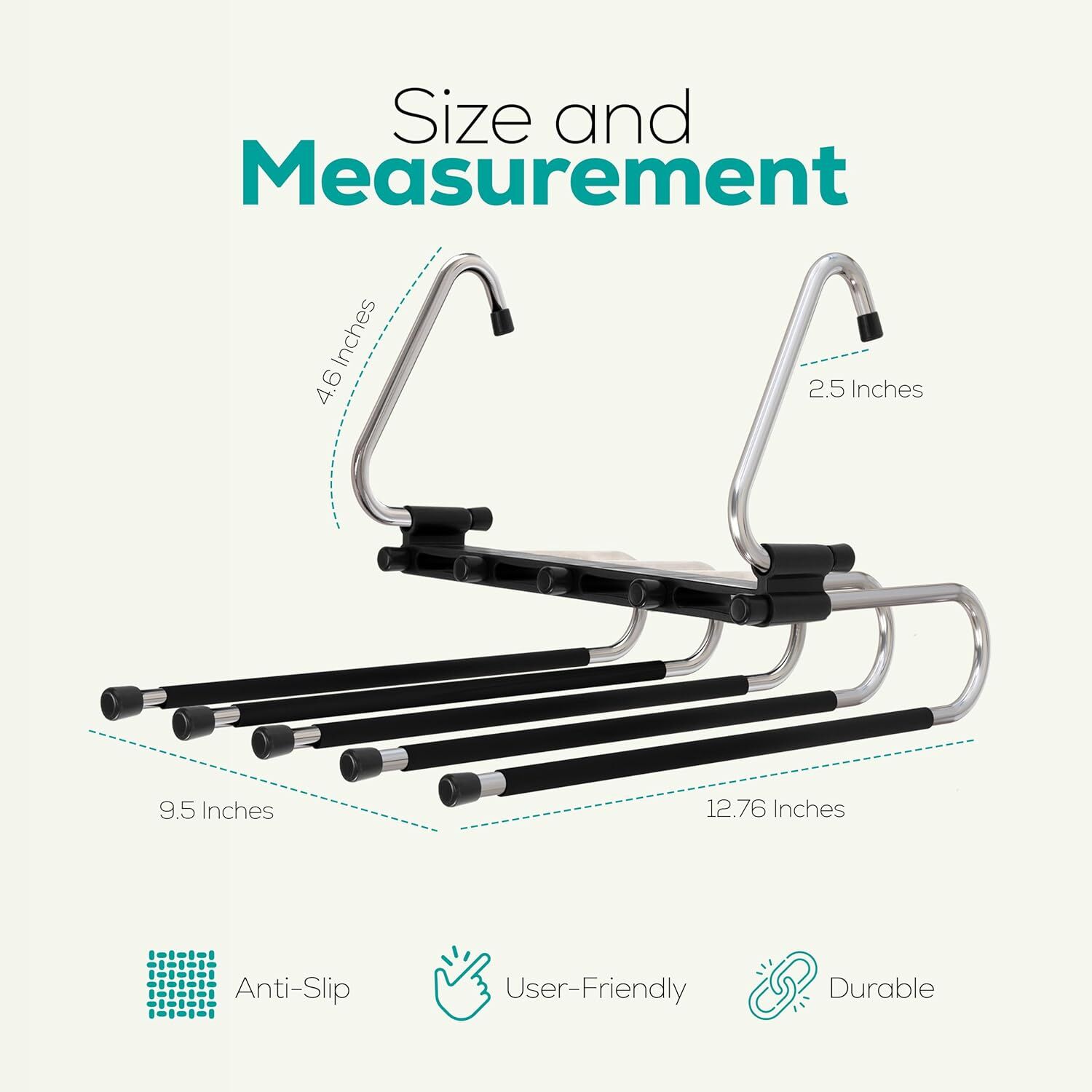 The 5-tier Pants hanger measures 12.76 × 9.51 inches with 2 hook Pipes and 1.94-inch space between each hanger. Ergonomically designed to preserve garment shape and save closet space.