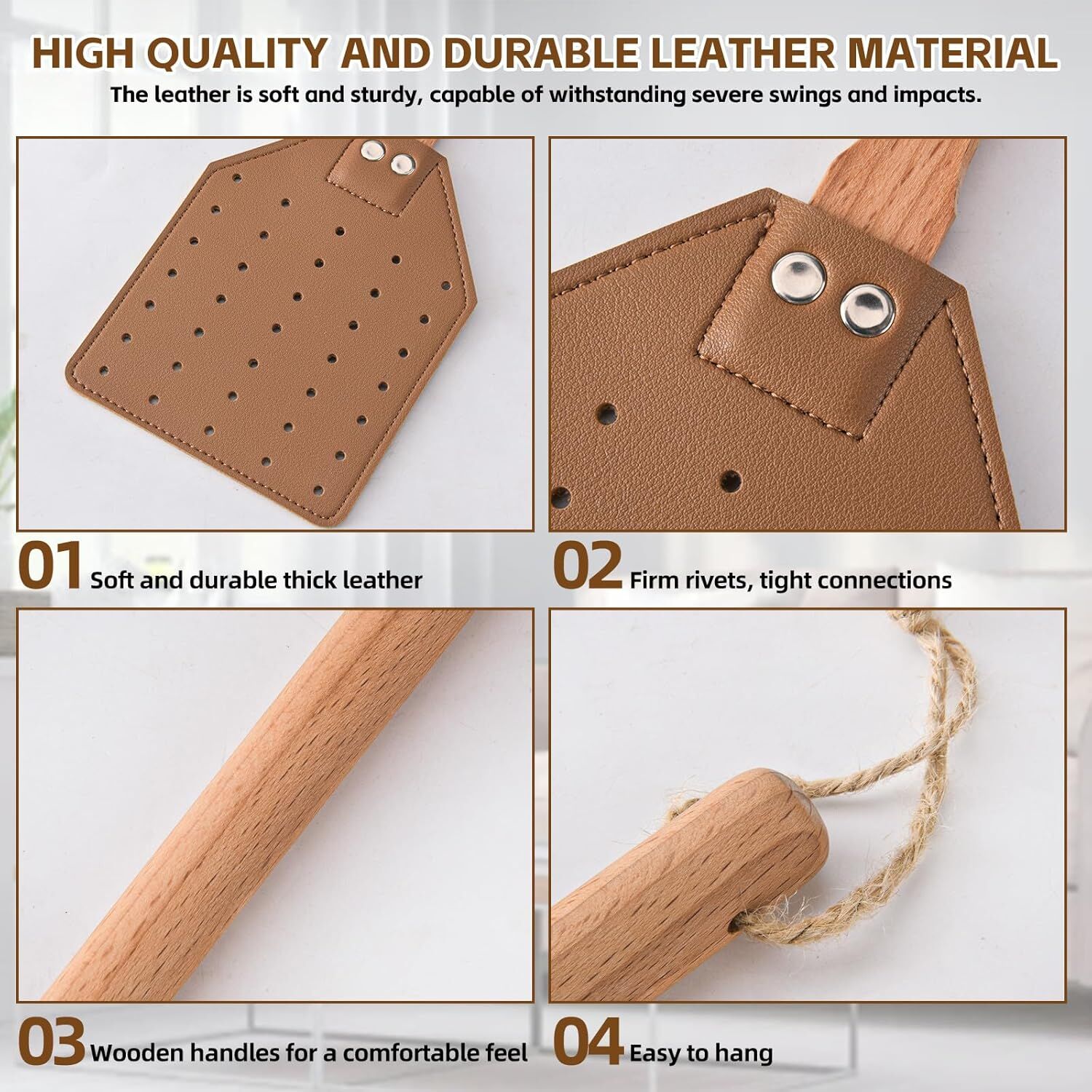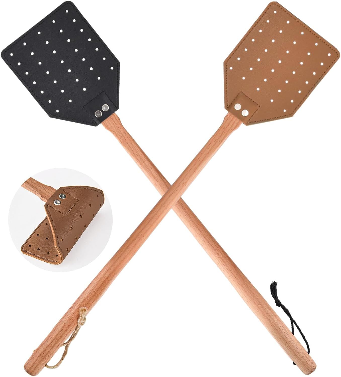 2 Pcs Leather Fly Swatter with Wood Handle, Durable Heavy Duty Fly Insects Catcher for Indoor Outdoo